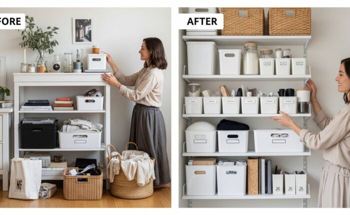 特に効果的なのは「ワンアクション収納」。物を取り出すときも戻すときも、一つの動作で完了する仕組みを作ることで、片づけのハードルが劇的に下がります。例えば、リビングでよく使う小物は蓋のないボックスに入れる、服は畳まずにハンガーにかけるだけにするなど。