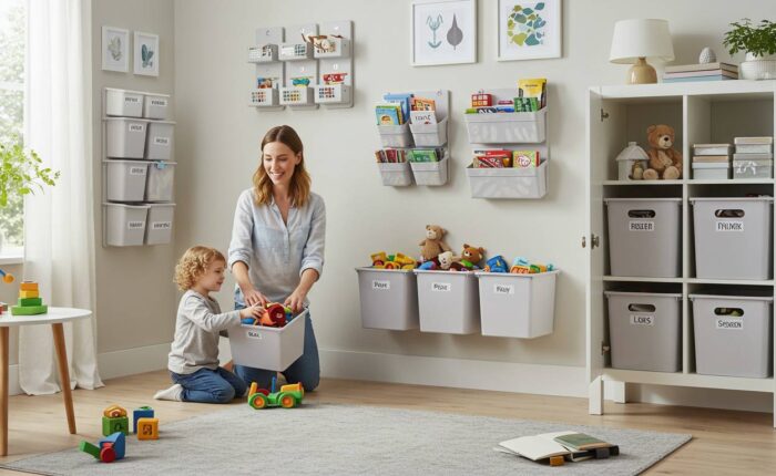 また意外と効果的なのが「立ったまま片付けられる収納」の導入。コンテナやカゴを活用して、かがまずに片付けられる環境を作れば、抱っこや授乳の合間にもサッと片付けられます。