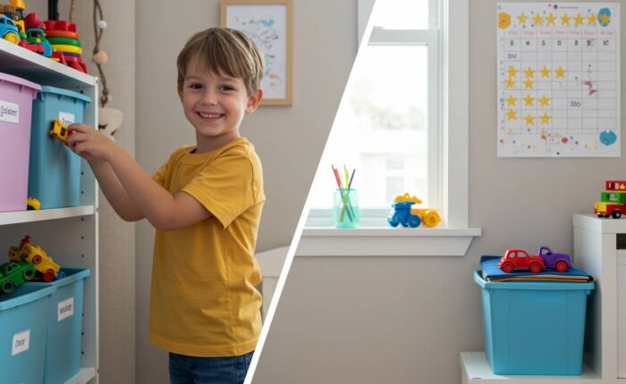 次に「小さな成功体験」を積み重ねることです。「おもちゃ全部片付けなさい」という大きなタスクではなく、「赤いブロックだけ箱に入れよう」など、達成可能な小さなステップに分けましょう。成功体験が自己効力感を高め、片付けへの前向きな姿勢につながります。