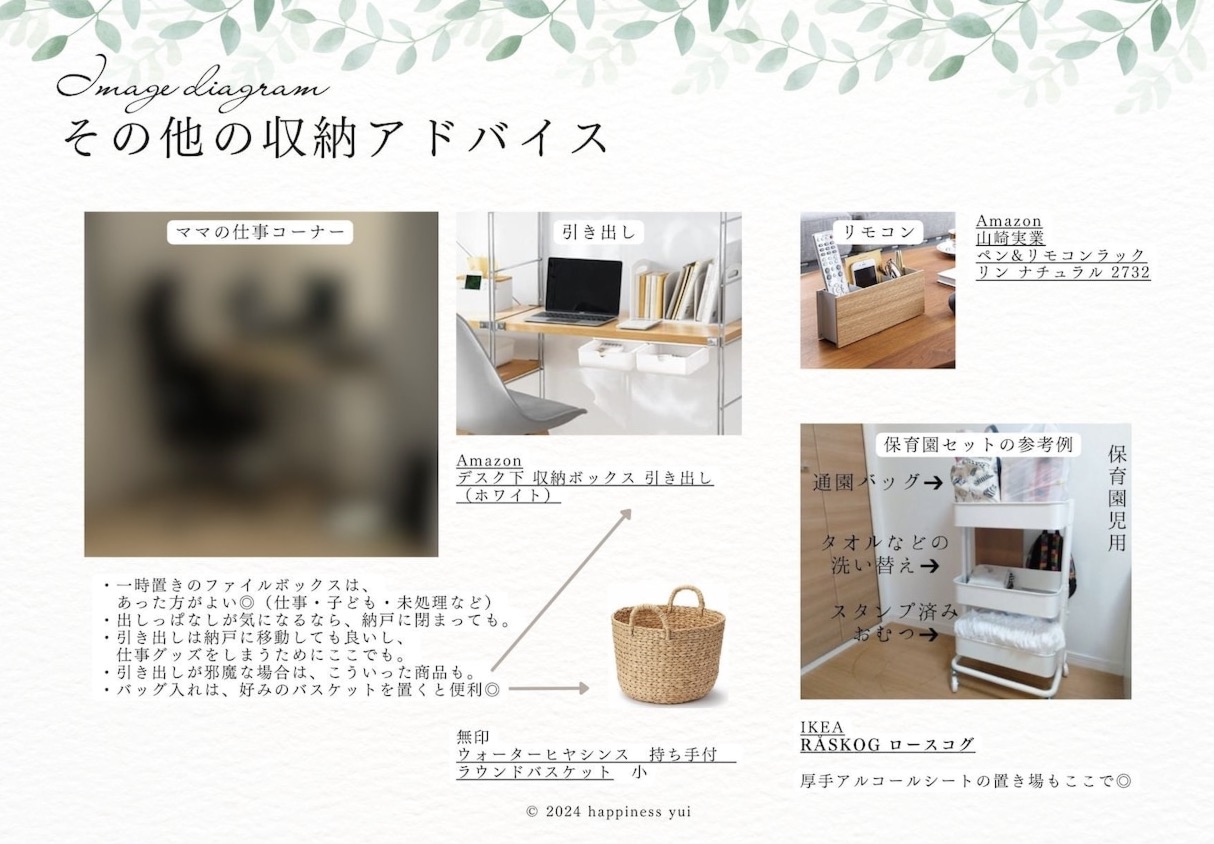 整理収納アドバイザーがZoomでお困りごとをお聞きし、簡単に片付く仕組み、家具の配置、片付けの手順、お客様に合った収納用品も含めてアドバイスさせていただきます。